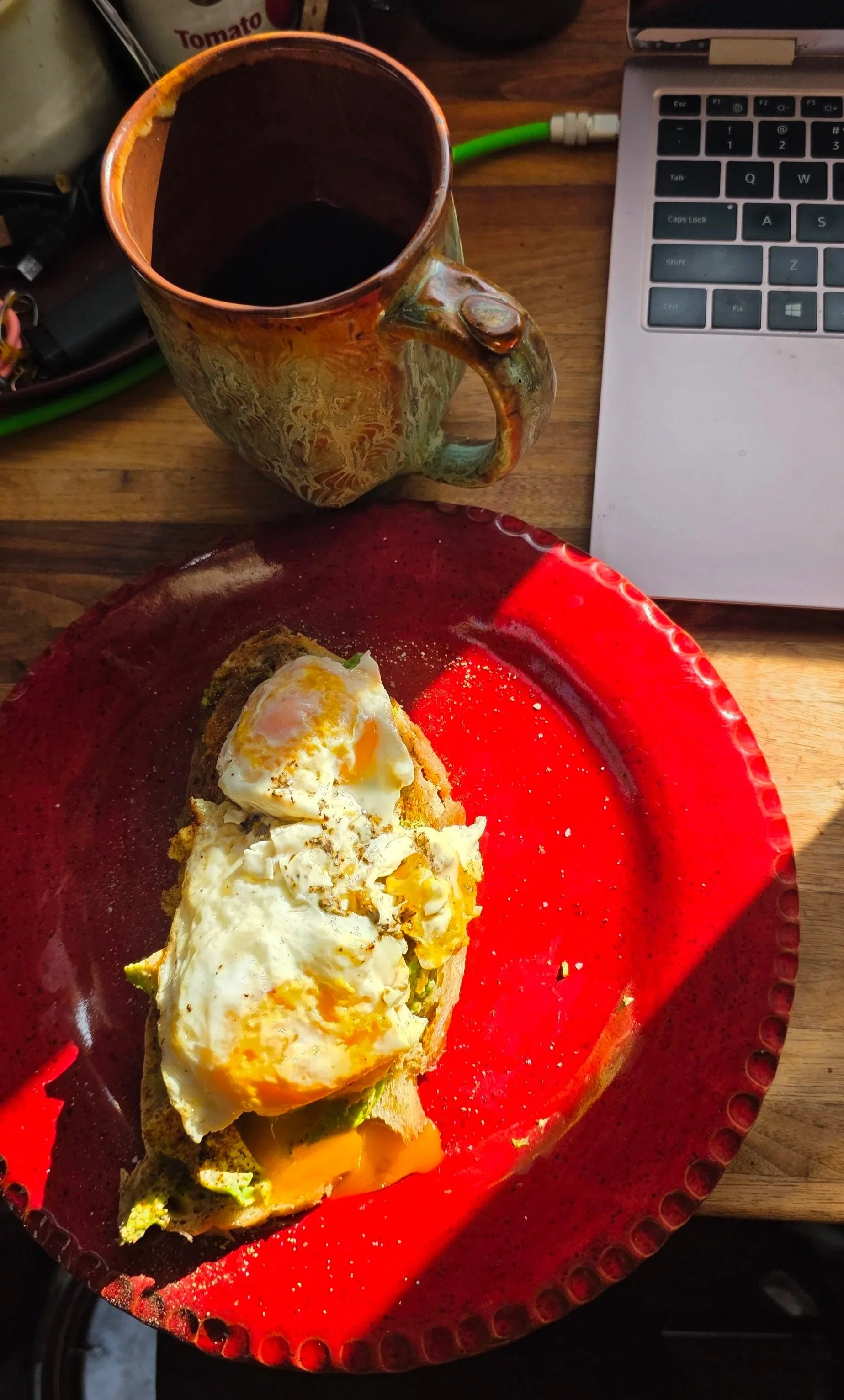 Butter on low, toasting bread > heat bacon grease > cut avocado > pre-set plate > pre-set spices > crack eggs (only when your toast is ready!) > smear avocado on toast > flip eggs > plate.